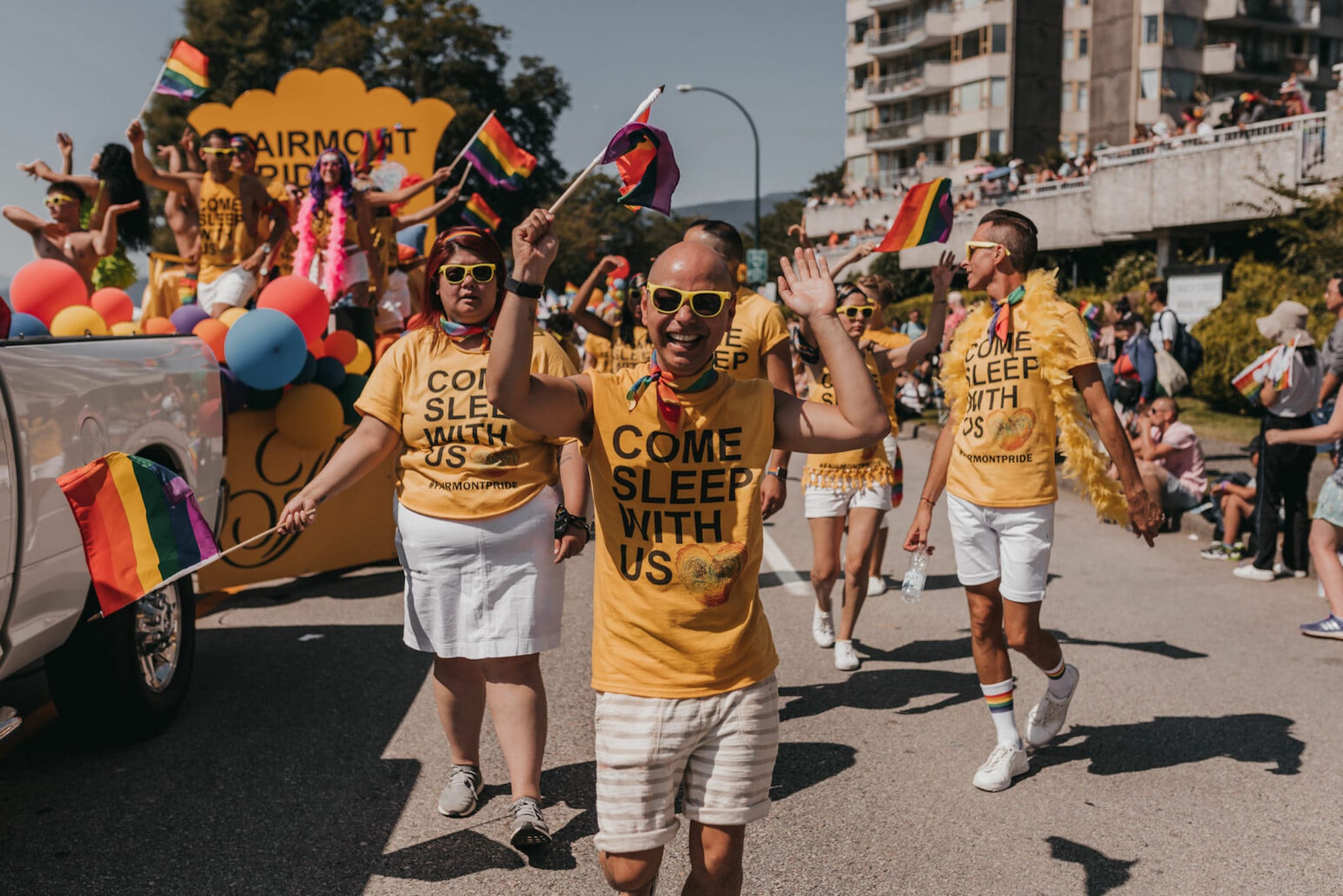 With our cheeky “Come Sleep With Us” slogan and eye-grabbing yellow shirts and float, our Heartists get loud and proud at Pride!